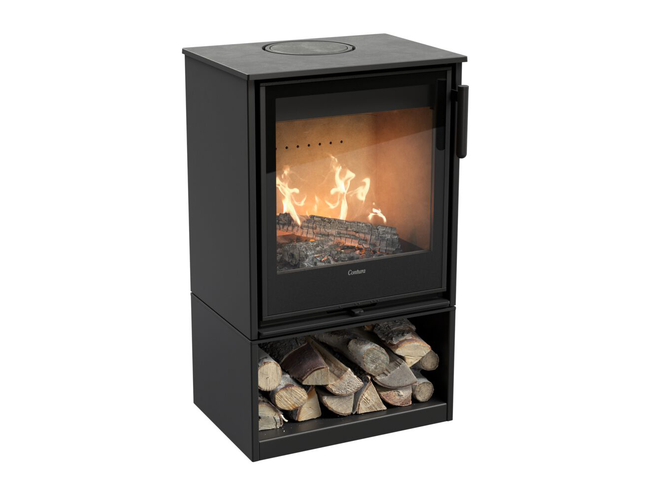 Sie können den Contura 210 entweder auf den mitgelieferten Beinen aufstellen oder auf dem optionalen Holzfach montieren, das als Zubehör erhältlich ist. Das Holzfach bietet zusätzlichen Stauraum und ist in Varianten mit oder ohne Tür erhältlich.