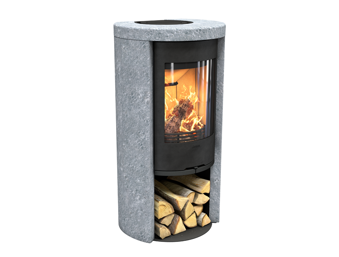 Korpus schwarz mit Gusseisenfront und Speckstein-Abdeckung, Seiten aus Speckstein